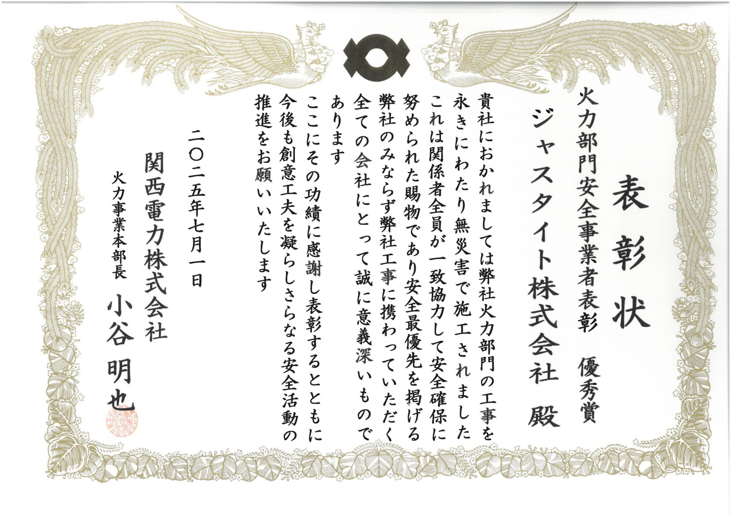 関西電力株式会社様から【火力部門安全事業者表彰】において優秀賞を受賞いたしました。安全管理体制・労働災害防止の取り組みを評価いただきました。社員一人ひとりが『安全最優先』を徹底し、日々の業務に取り組んできた成果と考えております。今後も引き続き、安全で信頼される事業活動を推進してまいります。