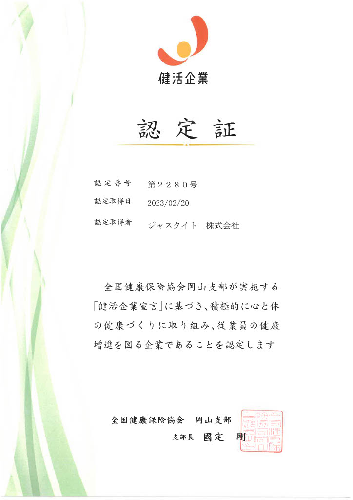 全国健康保険協会 岡山支部より 健活企業 認定証をいただきました。